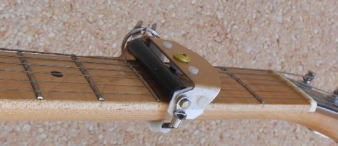 Our new design of rolling guitar capo, the "SIXTH FINGER" rolling capo for electric guitar. This capo can claim to be the fastest capo in the world, since the guitarist doesn't need any extra manoeuvres to move it. This capo rolls alongside the fretting hand up and down the fretboard, or up past the nut onto the pegboard when not in use.