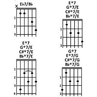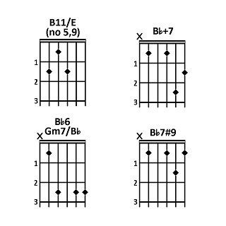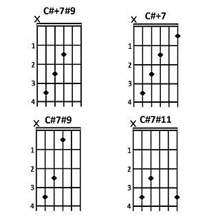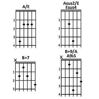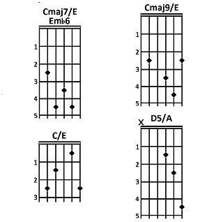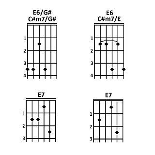 Many of these chords have two or more names. For instance, the A6 chord contains the same notes as the F#m7 (A, C#, E and F#).