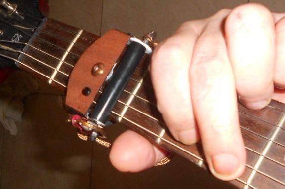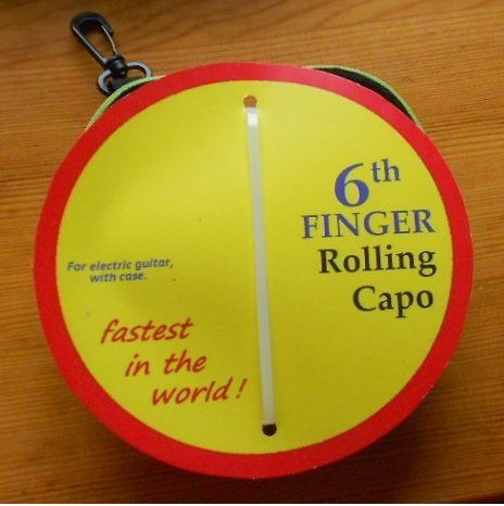 Our new design of rolling guitar capo, the "SIXTH FINGER" rolling capo for electric guitar. This capo can claim to be the fastest capo in the world, since the guitarist doesn't need any extra manoeuvres to move it. This capo rolls alongside the fretting hand up and down the fretboard, or up past the nut onto the pegboard when not in use.